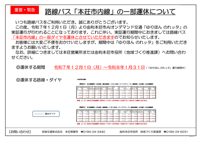 なお、詳細につきましては本荘営業所または由利本荘市役所(地域づくり推進課)へお問い合わせください。