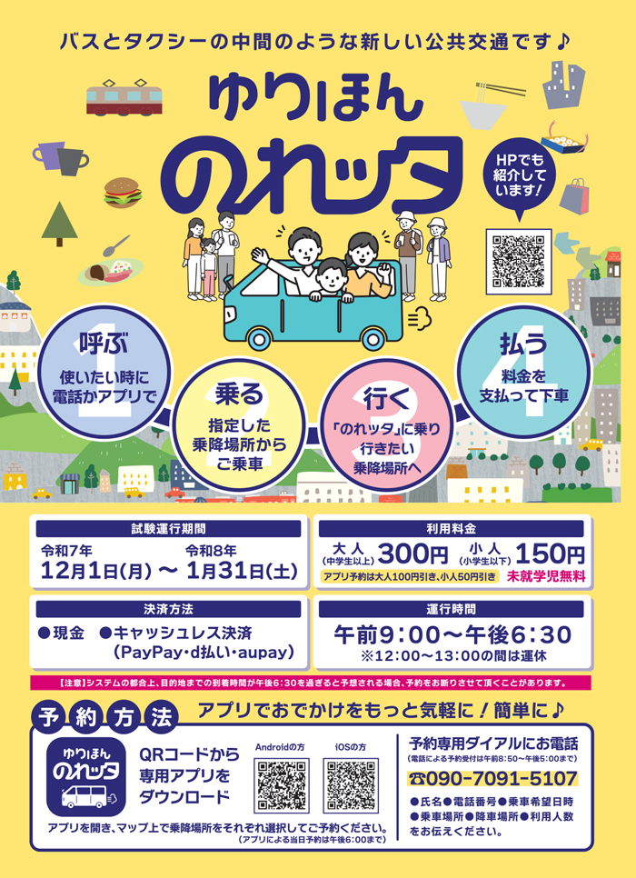 この度、令和7年12月1日(月)より由利本荘市AIオンデマンド交通「ゆりほん のれッタ」の実証運行が行われることになっております。