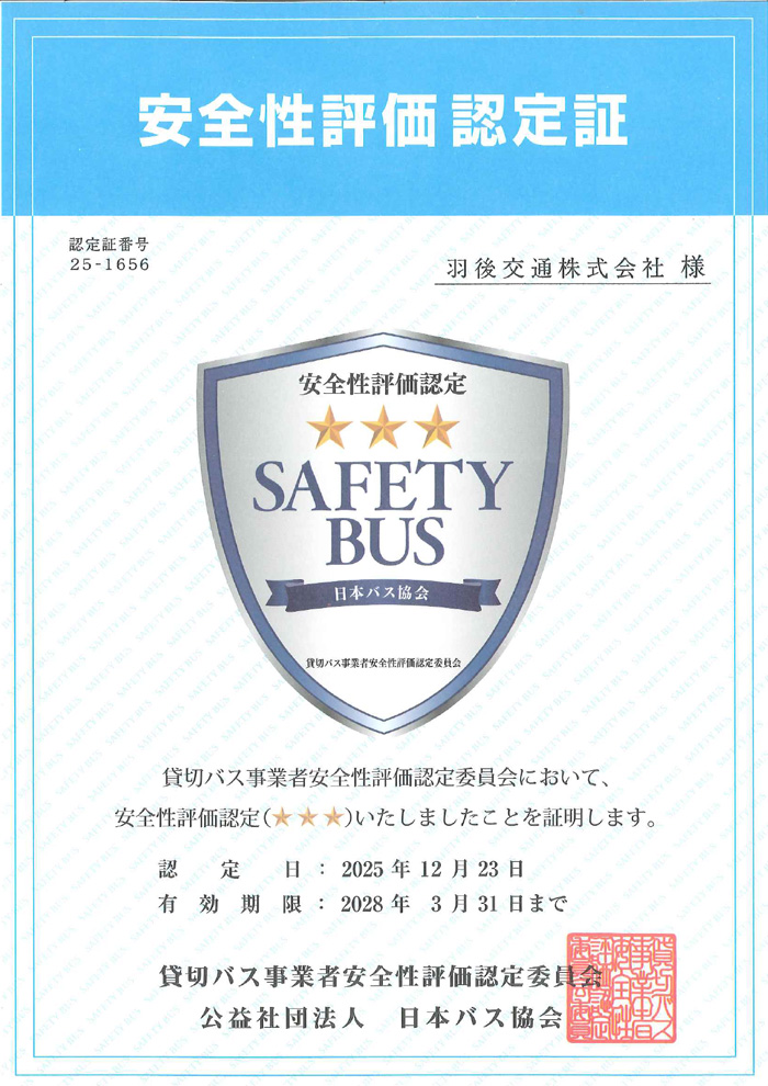 2025年12月29日 「貸切バス事業者安全性評価認定制度」三ツ星認定更新について 2023年12月15日付けで「貸切バス事業者安全性評価認定制度」の 三ツ星認定を更新しました。 クリックでPDFがご覧になれます。