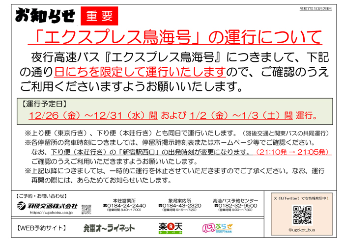 | 羽後交通 | 高速バス予約センター | TEL. 0182-32-9500 |