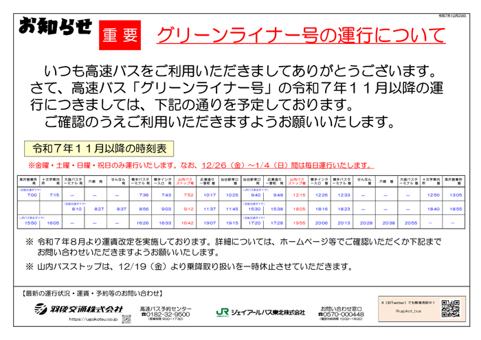 いつも高速バス「グリーンライナー号」をご利用いただきましてありがとうございます。