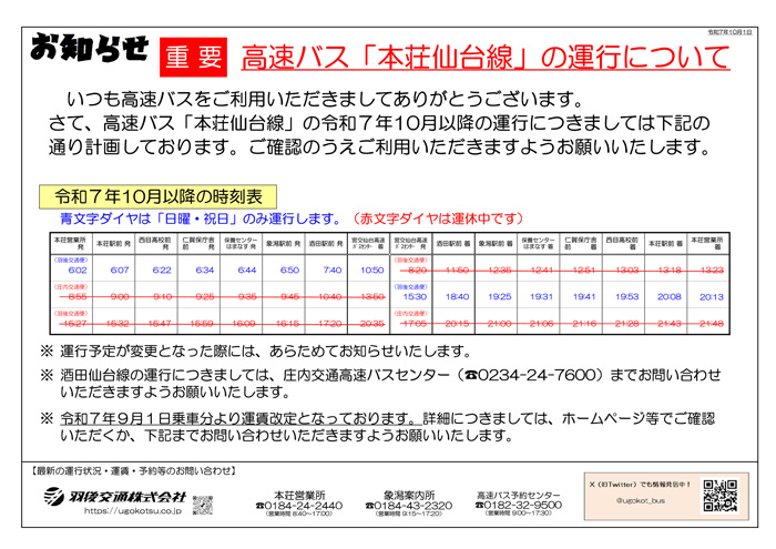 高速バス「本荘仙台線」の運行について