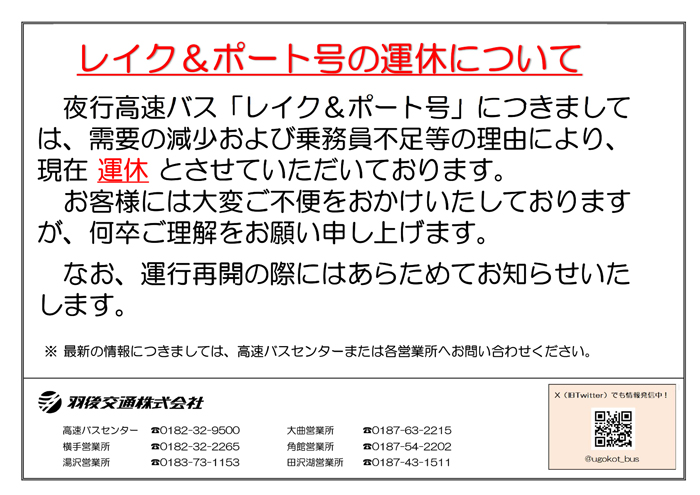 - ご不明な点につきましては高速バス予約センター(TEL:0182-32-9500)または最寄りの各営業所へお問い合わせをお願いします。